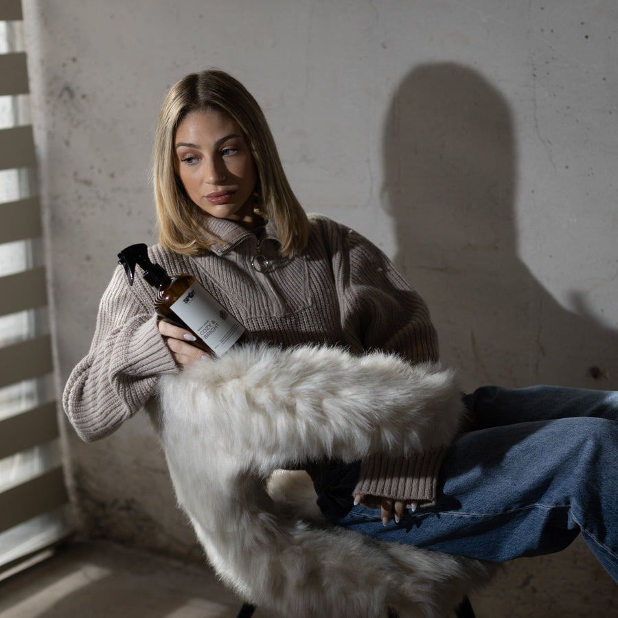 Nuestro Spray home no mancha, debes aplicarlo en telas a 20 cm de distancia.